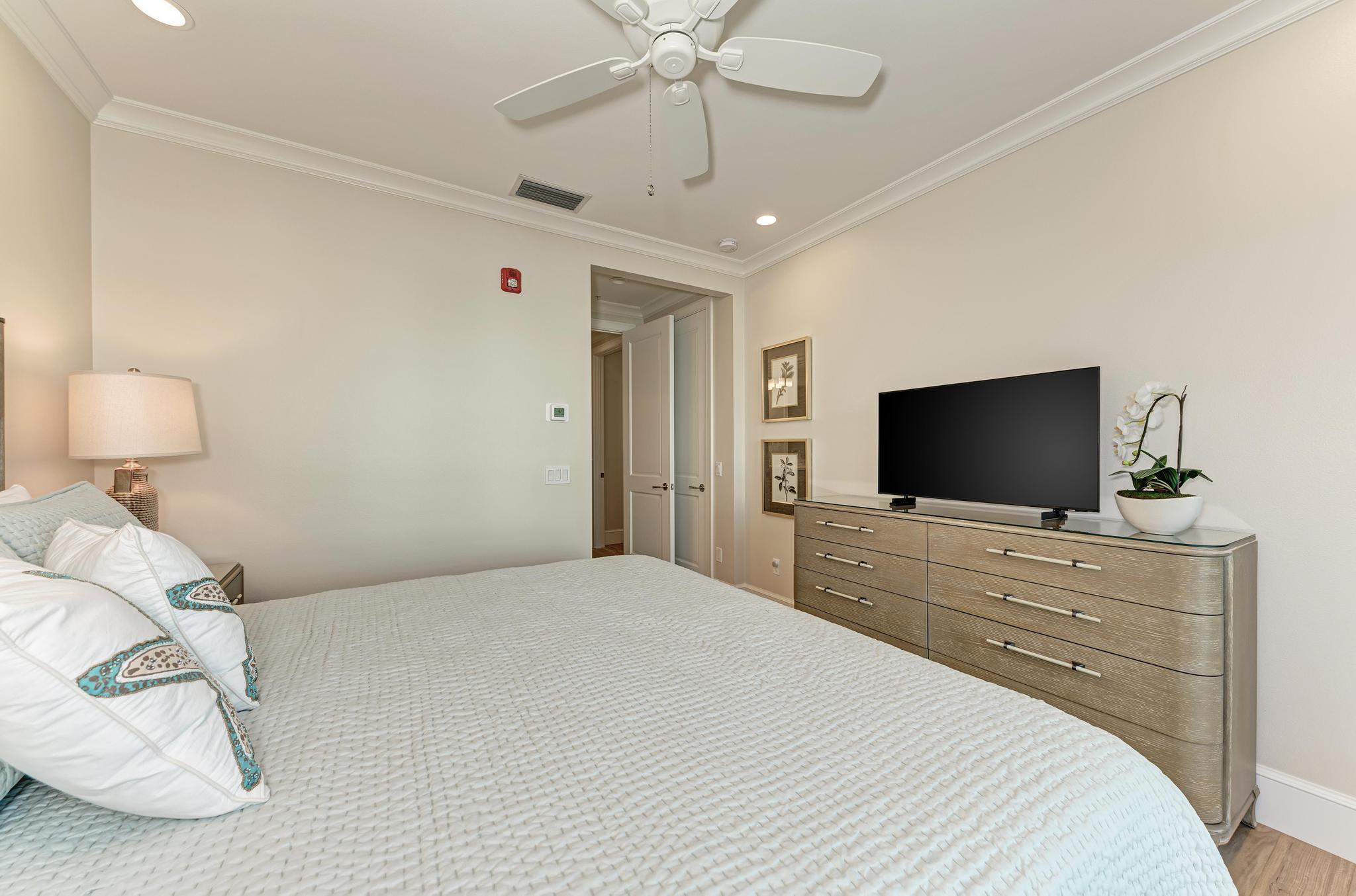 Vacation is a great time for rest. Each of the 4 professionally decorated bedrooms has a king size bed with premium hotel quality linens, serviced by a professional linen program, and upgraded mattresses. Additionally, a king size sleeper sofa is in the living room to ensure all will sleep comfortably. Each bedroom is complete with a smart TV and ceiling fan.